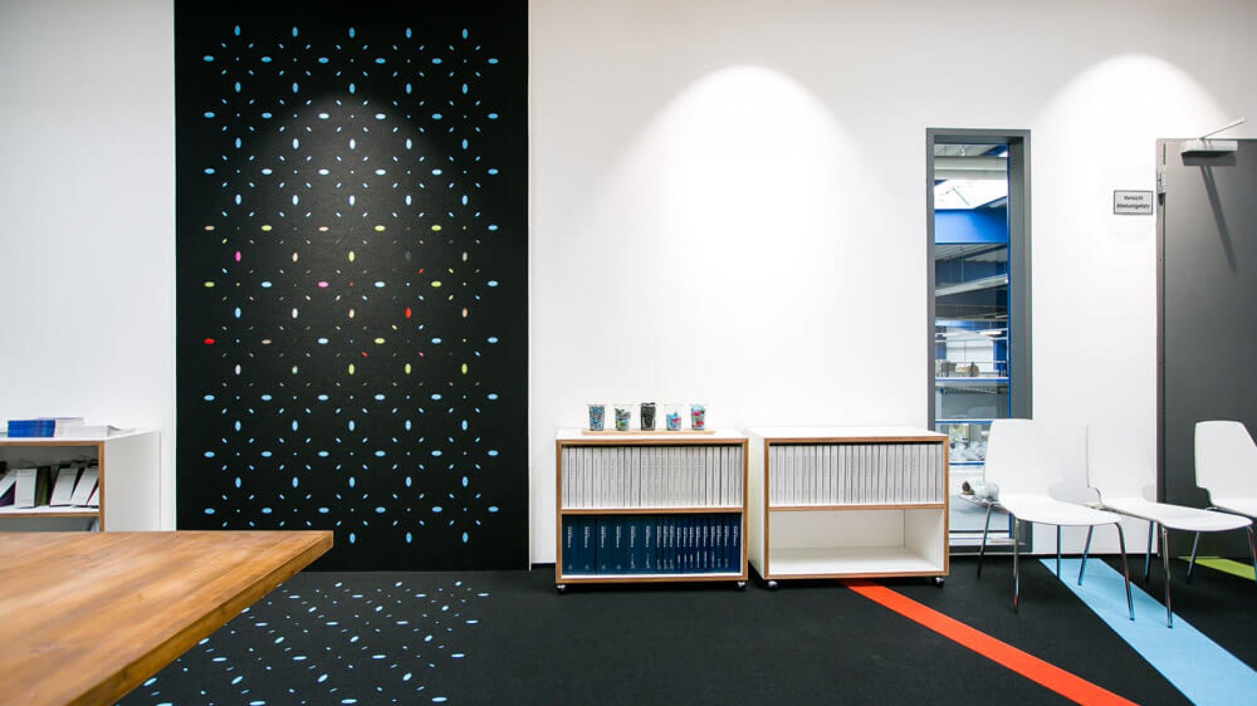Boden und Wand lassen sich so stimmig gestalten. Gleichzeitig verbessert die offene Faserstruktur des Materials die Raumakustik merklich und sorgen für strapazierfähige Wandflächen z. B. als Akustikpanel, Pinn- oder Trennwand.